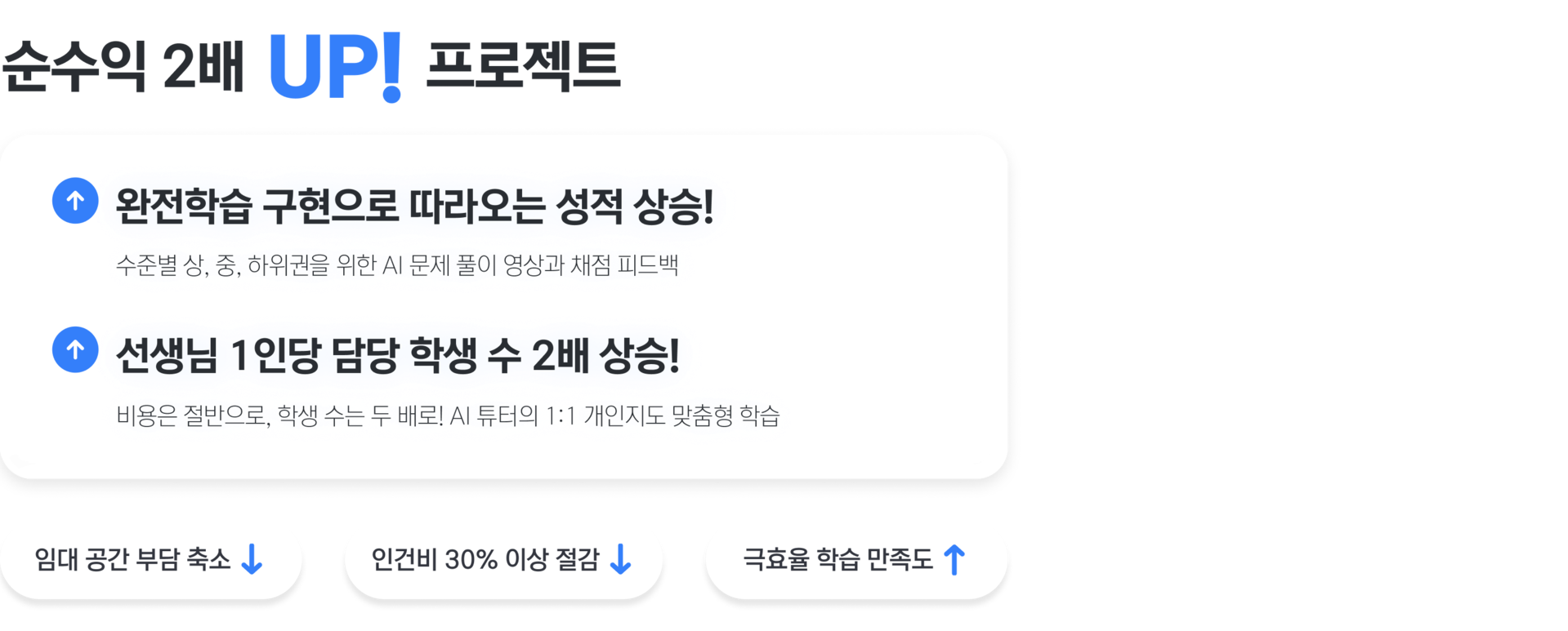 학원에서 사용될 경우 학원의 특성에 맞게 커스터마이징이 가능하며, 인근 학교의 기출 문제은행도 자체적으로 구축할 수 있는 시스템을 제공한다. 무학년, 무레벨, 무정원, 무교재로 진행할 수 있는 '거꾸로 수업' 또한 가능하며, 학습 경험을 차별화하고 다양한 방식으로 제공한다.