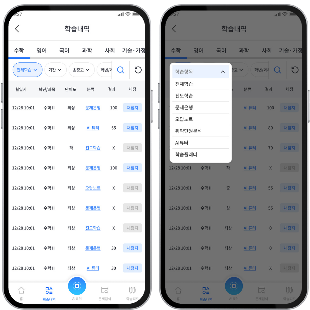 다양한 항목으로 확인할 수 있는 학습내역문제로 이동해서 복습하거나