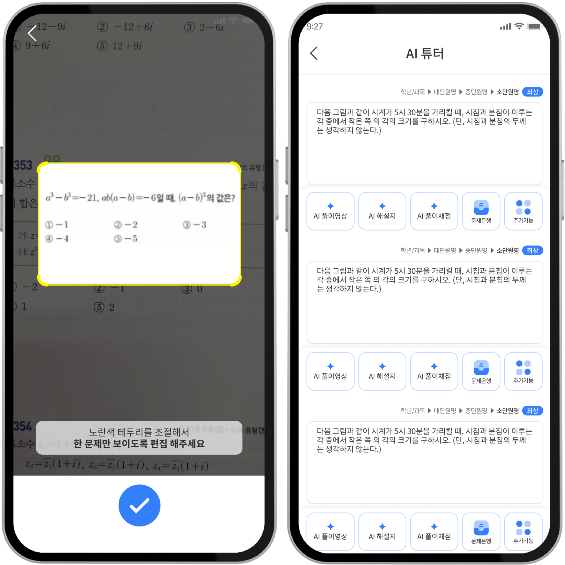 목표를 설정하고 '학습 시작' 으로 AI 튜터로 사진 찍고연동하여 다양한 솔루션으로 완전 학습 달성!